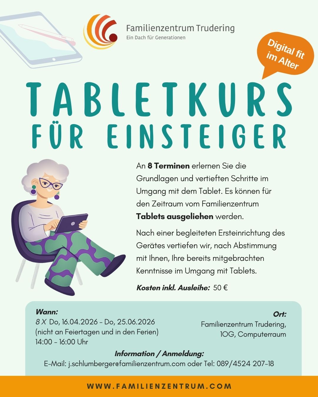 Tablet-Kurs Auch in diesem Frühjahr gibt es die Möglichkeit, an 8 Terminen die Grundlagen und vertieften Schritte im Umgang mit dem Tablet zu erlernen. In Kooperation mit „Digital mobil im Alter“ und der Telefónica Deutschland O2 können für den Zeitraum vom Familienzentrum Tablets ausgeliehen werden. Nach einer begleiteten Ersteinrichtung des Gerätes vertiefen wir, nach Abstimmung mit Ihnen, Ihre bereits mitgebrachten Kenntnisse im Umgang mit Tablets. Unsere geschulten Digitalpaten stehen Ihnen hier an Ihrer Seite und begleiten Sie. Wann: Do, 16.04.2026 - Do, 25.06.2026 (8 Termine, nicht an Feiertagen und nicht in den Ferien) Wo: Computerraum, 1. Stock, im Familienzentrum Trudering Kosten: 50€ Anmeldung: 089 4524207-0 oder per Mail kontakt@familienzentrum.com