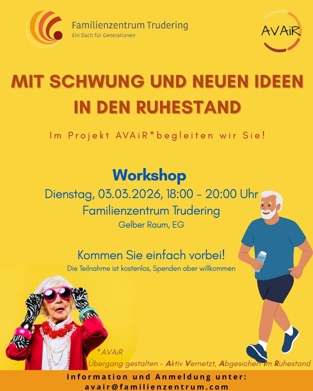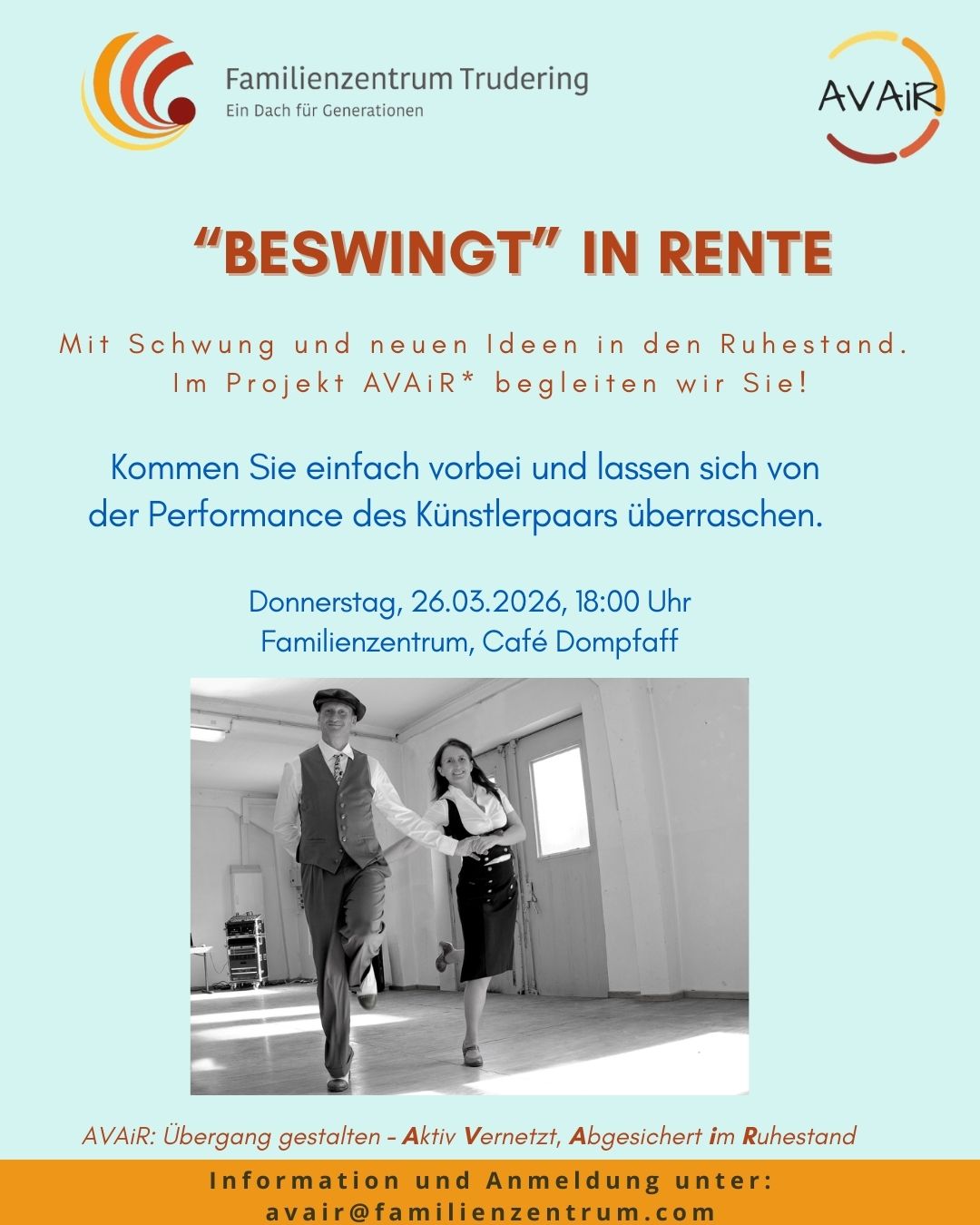 "Beswingt" in Rente mit Schwung und neuen Ideen in den Ruhestand. Im Projekt AVAiR begleiten wir Sie! Kommen Sie einfach vorbei und lassen Sie sich von der Performance des Künstlerpaars überraschen. Wann: Donnerstag, 26.03.2026, 18:00 Uhr Wo: Café Dompfaff Infos und Anmeldung: unter der Mail avair@familienzentrum.com