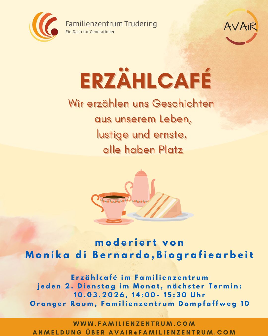 Biografisches Erzählcafé Wir wollen einander Geschichten aus unserem Leben erzählen. Lustige und ernste – alles hat Platz. Dabei geht es aber nicht nur um ein individuelles, biografisches Zurückschauen, sondern auch um Zuhören. Menschen mit anderen Lebenserfahrungen, anderen Werten und anderen Zielen zuzuhören und uns berühren zu lassen. Wir wollen uns von Lebensgeschichten begeistern lassen. Anschließend können wir unsere Gedanken in lockerer Runde bei Kaffee und Kuchen weiter schweifen lassen. Melden Sie sich an (unter der Mail avair@familienzentrum.com) oder kommen Sie spontan vorbei. Das Erzählcafé ist kostenlos, Spenden aber willkommen. Wann: Dienstag, 10.03.2026, 14:00 - 15:30 Uhr Wo: Familienzentrum Trudering, orangener Raum, 1. OG |